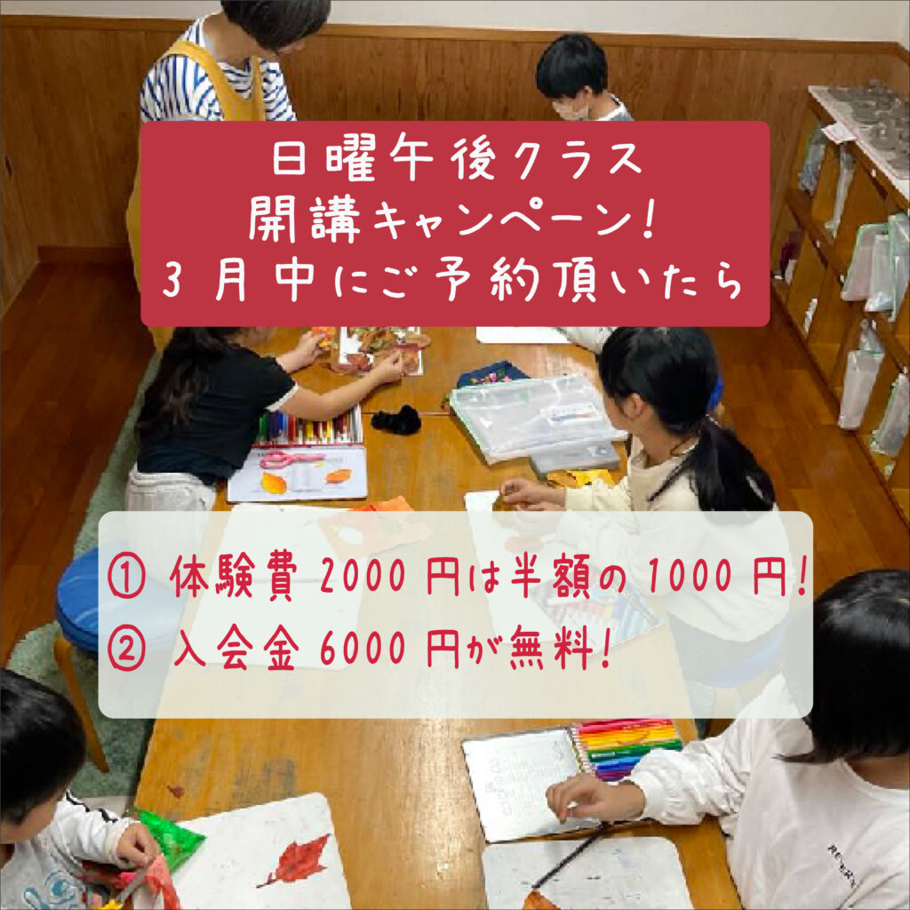 | 参加費 | 参加費 ご入会の場合は入会金は 日曜午後のアトリエ開講キャンペーン中です 3月中にご予約頂くと参加費は半額の1000円(税込み)になります さらに ご入会の場合は入会金無料になります |