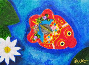 ブリキの金魚 油彩 F4水面に浮いている感じのストーリー性がとても面白く花や葉っぱのレイアウトも素敵です